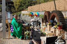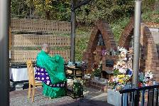 読経が始まり、最初は合同墓地、個別墓地、埋葬塔“おやすみ”の順で読経して頂き、合同供養塚、火葬炉そして一番古いお骨が眠っている”永遠”を前に手を合わせ清めの言葉を唱えて頂きました。